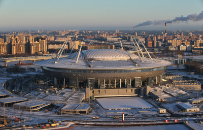 Стадион строился с 2007 года, вместимость арены - 68 тысяч зрителей. Он примет матчи крупнейших футбольных турниров - Кубка конфедераций 2017 года, Чемпионата Мира 2018 года и чемпионата Европы 2020 года. Стоимость строительства стадиона составляет порядка 41 млрд рублей, проект арены неоднократно корректировался. В июле администрация Петербурга расторгла контракт с генподрядчиком компанией "Инжтрансстрой-СПб" (дочерняя компания "Трансстроя"), новым генподрядчиком по достройке стадиона и прилегающих территорий стала петербургская компания "Метрострой".